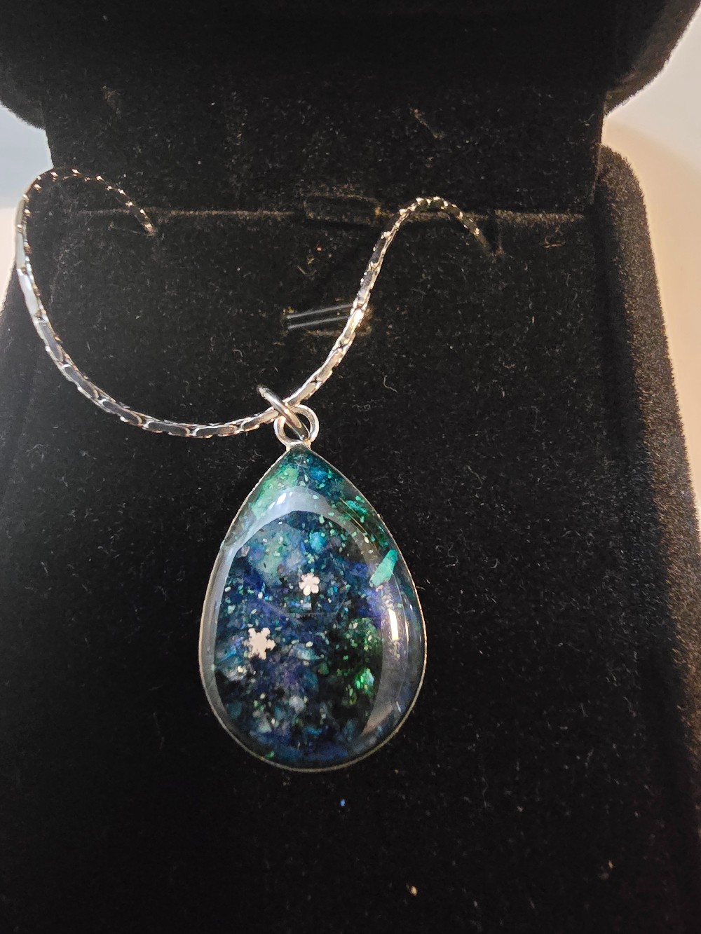 Two preserved snowflakes encased in resin on a silver chain